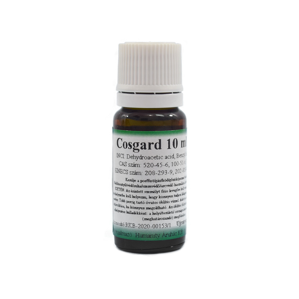 A cosgard a saját készítésű kozmetikumokban megakadályozza a gombák, baktériumok elszaporodását. Hatékonysága terméktől függően min 1-3 hónap.