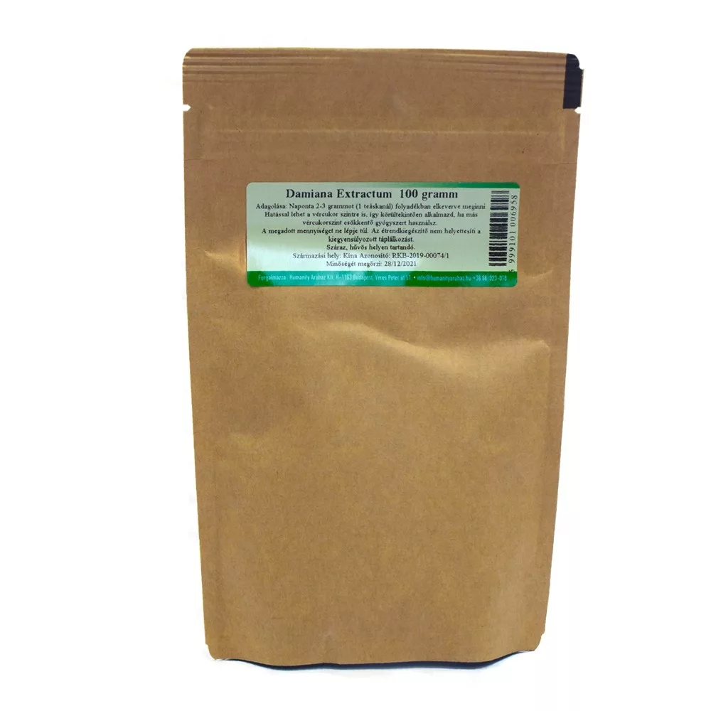 Színben barna, nedvesség hatására erősen ragacsos állagúvá válik. Megjelenése és töménysége eltér a damiana portól. A növény leveléből állítják elő.
