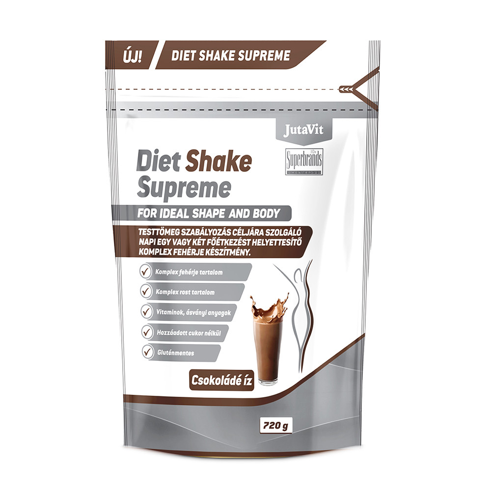 JutaVit Diet Shake Supreme. Csokoládé íz. Testtömeg-szabályozás céljára szolgáló, a napi étrend egy részét helyettesítő élelmiszer édesítőszerekkel. Hozzáadott cukor nélkül.