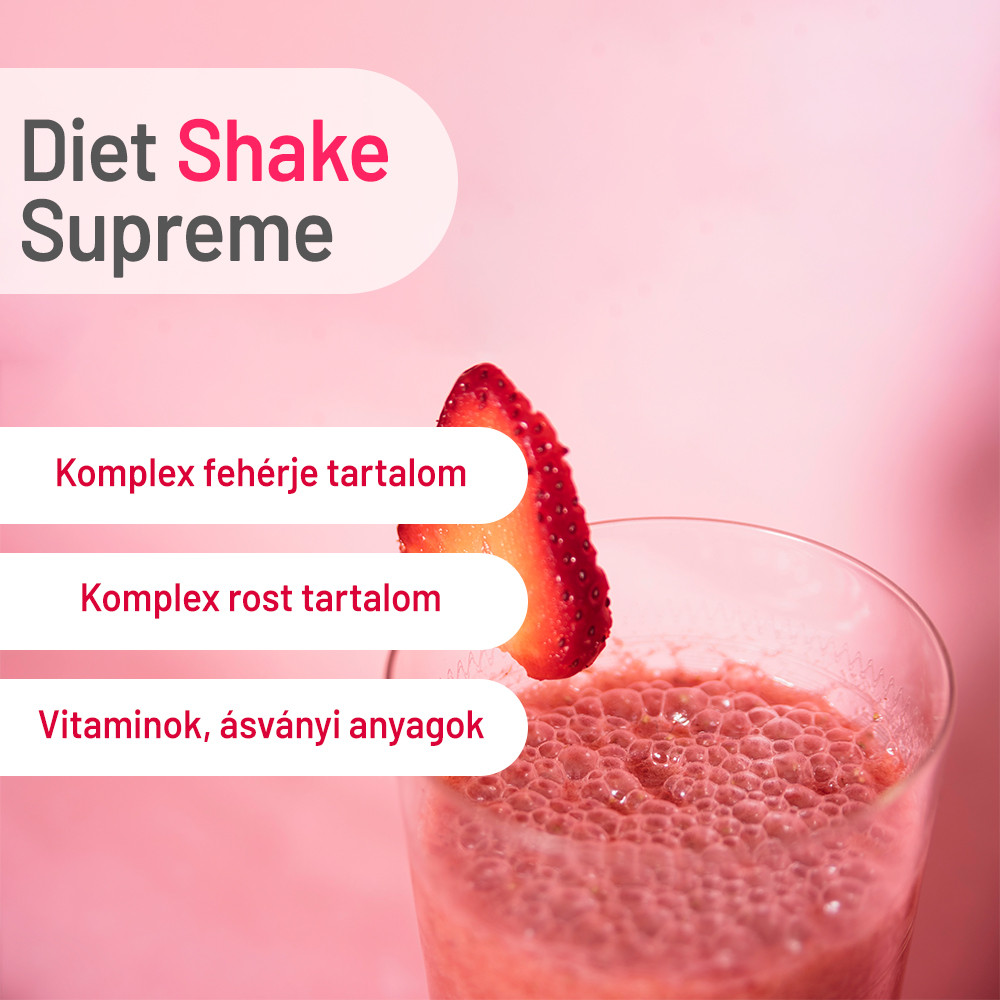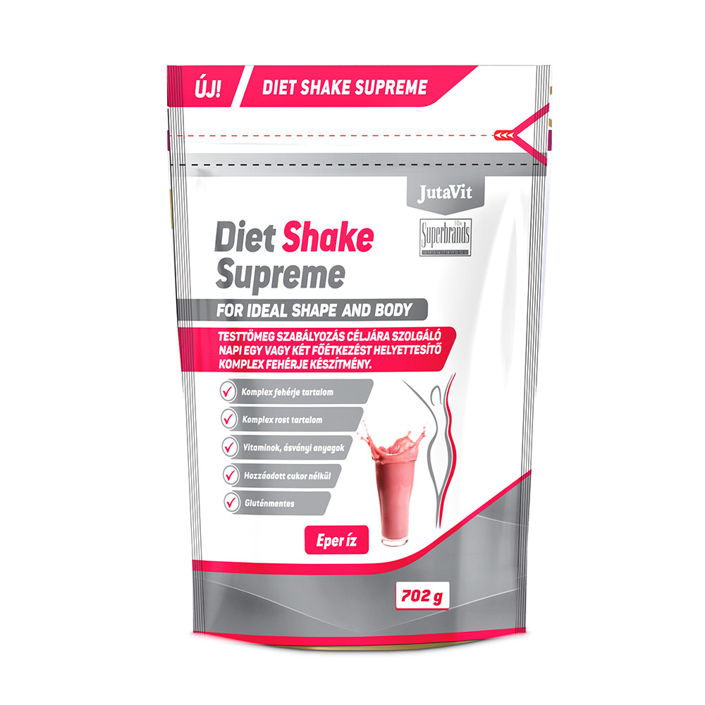 JutaVit Diet Shake Supreme. Eper íz. Testtömeg-szabályozás céljára szolgáló, a napi étrend egy részét helyettesítő élelmiszer édesítőszerekkel. Hozzáadott cukor nélkül.