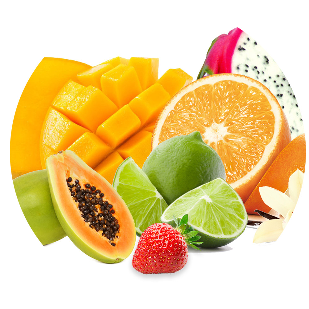 Közép: mangó, sárkánygyümölcs, papaya, fahéj