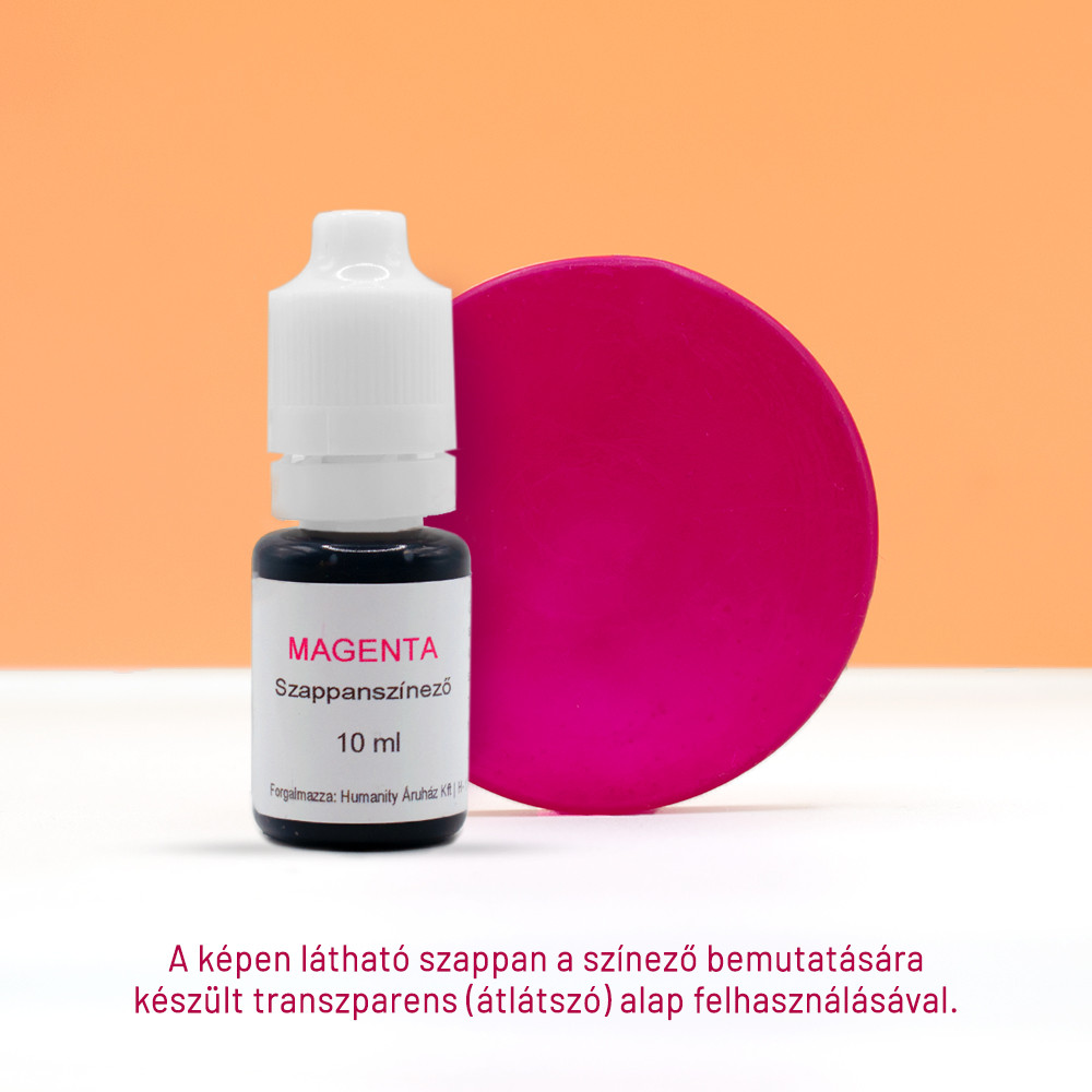 Magenta színű folyékony, glicerines színezőanyag, könyen kezelhető, gyermekzáras, cseppentős flakonban, szappanhoz, kozmetikumokhoz.