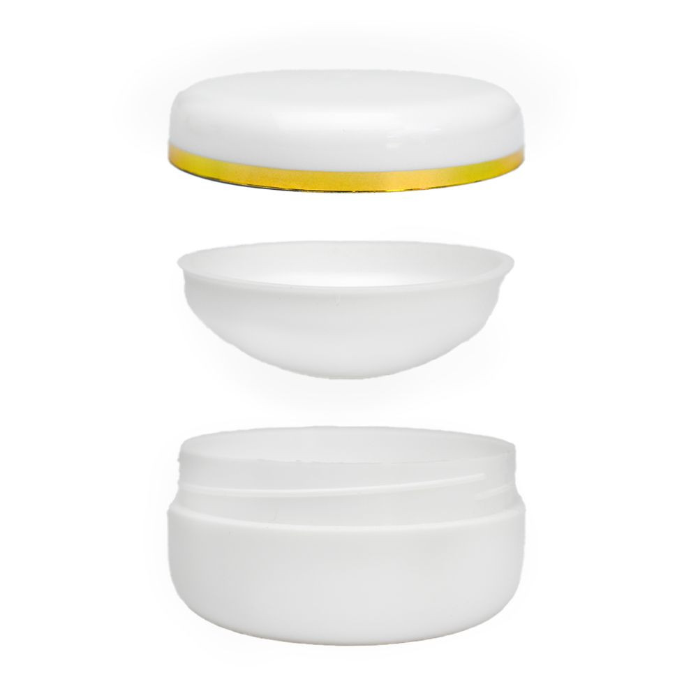 A hengeres formájú tégely fehér színű. A tető szélén arany színű csíkkal. Menetes nyaktípusú, fehér színű, megfelelően záródó polipropilén (PP) tetővel betéttel.